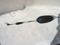 Auf der linken Seite seht ihr einen Wirbel, Gummiperle, ein Endstück vom Karbonstab, (welches durchgebohrt werden muß), ein Stück Silikonschlauch, dann das Blei (dass mit einem 4mm-Bohrer aufgebohrt werden muß), wieder ein Stück Silikonschlauch und ein Stück Hart-PVC ( so dass die Kugel geschützt wird und nicht so stark vom Silikonschlauch beim Verschieben eingedrückt wird).