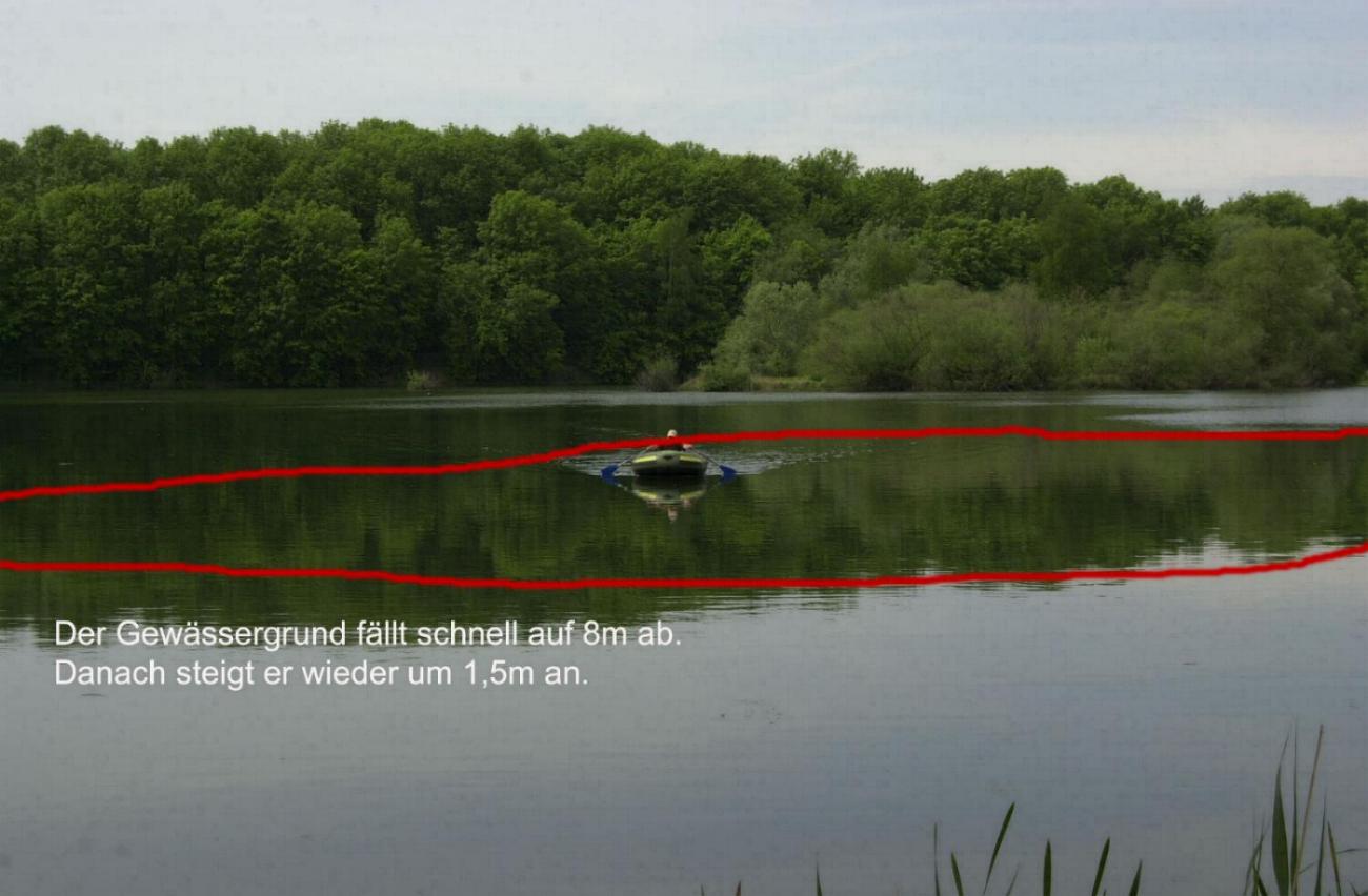300gr Pose so austarieren, das sie mit Blei und Köder gerade noch 1/4 oder weniger aus dem Wasser herausragt. Tiefe <= 7m einstellen und in den 8m Bereich ausbringen. Die Pose treibt solange, bis das Blei eine Kante bei der eingestellten tiefe gefunden hat. Wenn der Köder nicht einfach am Grund liegen soll, den Köder am Seitenarm mit etwas auftrieb fischen -> dann muß das Blei der tiefste Punkt der Montage sein.