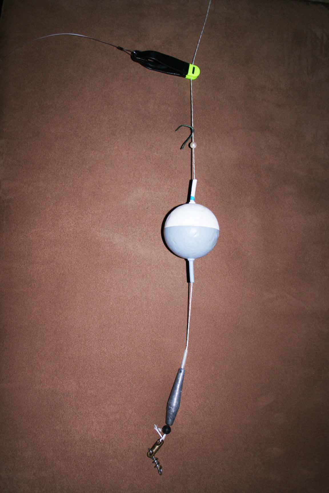 Gummistopper -> Posenadapter mit 80g Pose (Freilaufend) -> Kunststoffperle -> Knotenlos ->Wirbel mit Karabiner -> Olivenblei und Vorfach im Karabiner eingehängt.
