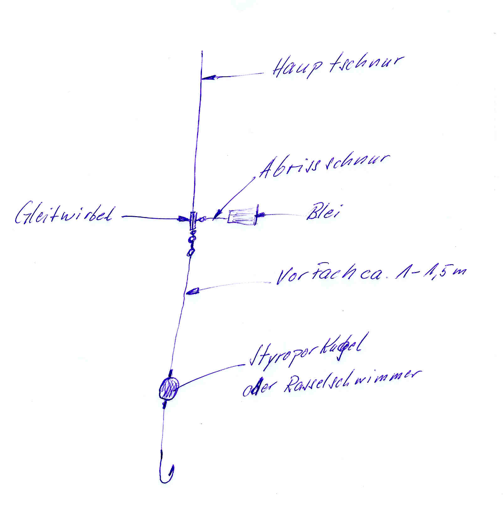 Ein Teil mehr in der Montage,das aber nicht sein muß.Reiseleine am Wirbel mit Stein verbinden,garantierter Selbsthakeffekt,ohne Boom,ohne Stopperperle,ohne großen Aufwand,schnell und einfach!!!
