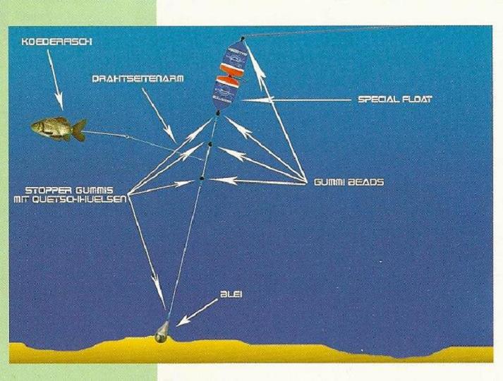 Benutze doch einfach ne simple U-Posen Montage. Lass die Fummelei mit der 0,35er Schnur und der Pose. Und montiere an der Stelle des Drahtes ne U-Pose. Die hält den Köder auch über Grund und lässt sich tüddelfreier Auswerfen als die Montage auf der Zeichnung.