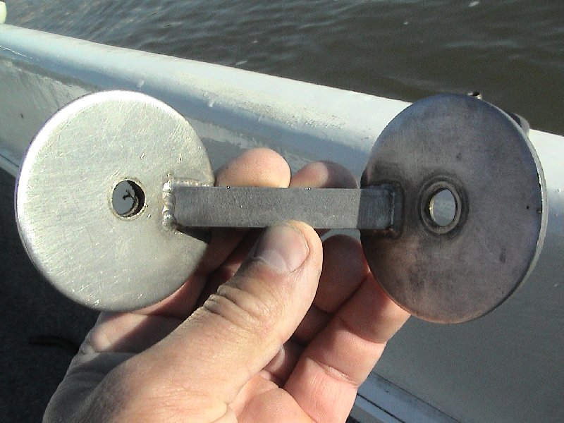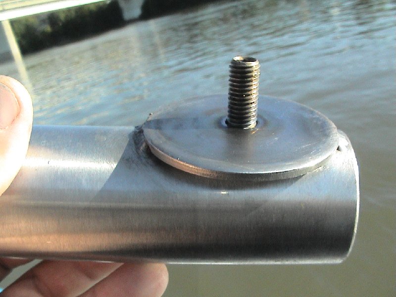 der rest ist auf den bildern denke ich mal gut zu erkennen.passende va reststücken gibt es in fast jeder treppenschlosserei.noch ein ganz wichtiger tip bei der verarbeitung.HALTET EUCH FERN VON EISEN (eisenspäne+eisenstaub) das gibt sonst später superhässliche rostflecken auf dem va.mein schlossermeister meinte auch das es sinn macht v4a zu verbauen,da das auch seewasserbeständig ist (wers braucht) zwischen die ronden werden gummischeiben gelegt und dabei bitte drauf achten das es gummi mit stumpfer oberfläche ist denn es gibt auch sehr glatte gummis die hierfür ungeeignet sind.bei ersteinstellen der fertigen rutenhalter bitte immer drauf achten das der der zug des fischen das gewinde immer zuzieht !!!wenns jemand andersrum probiert,kann es sein das der fisch mit dem zug das gewinde öffnet, die stange ins wasser klatscht und vielleicht verloren ist.zum abspannen sind diese halter nur bedingt geeignet,dafür habe ich mir dann aber wieder andere halter ins heck gebaut.