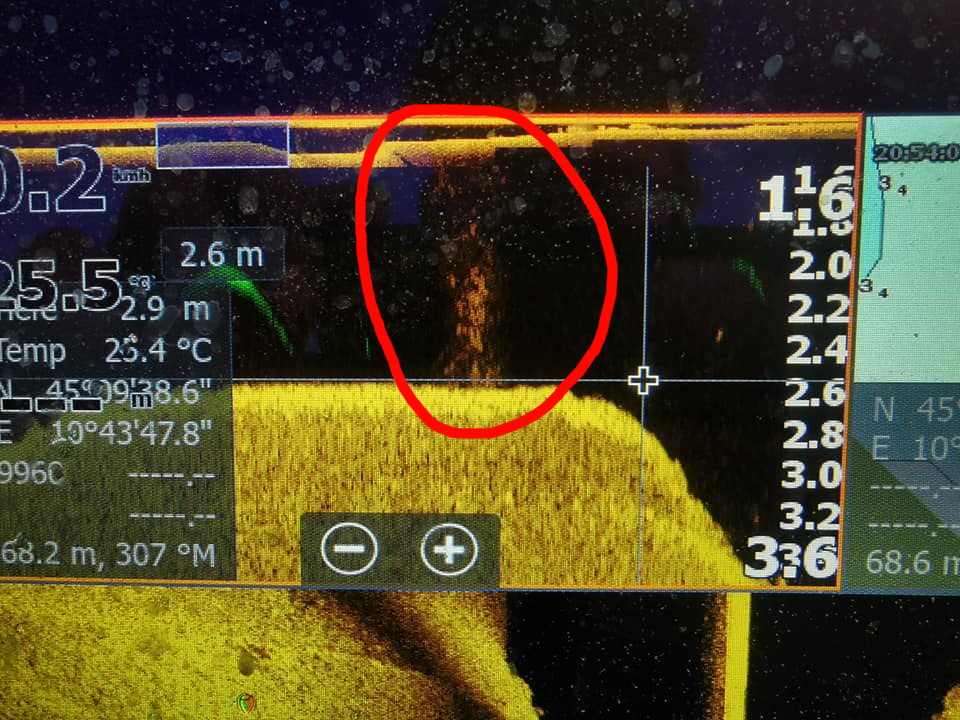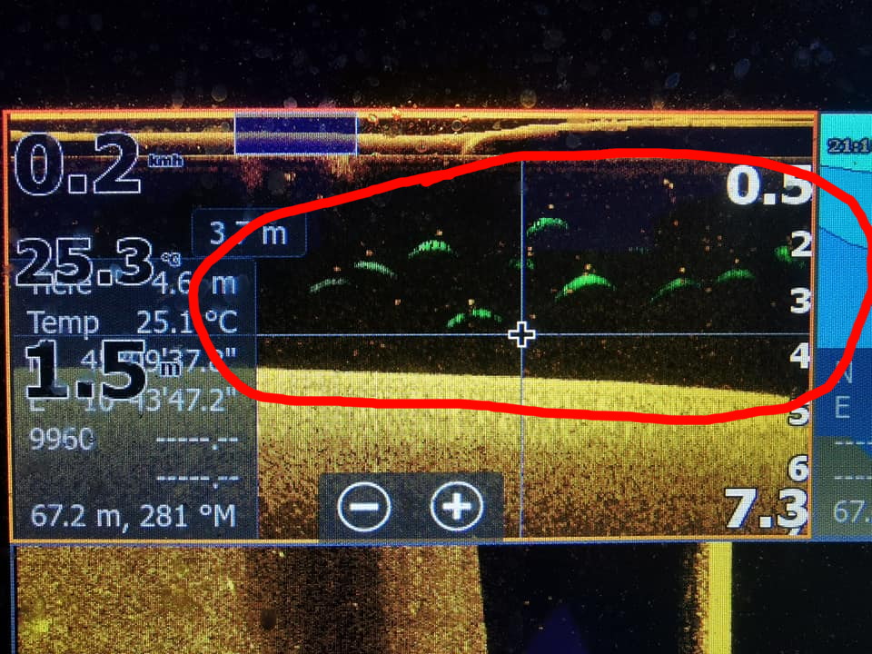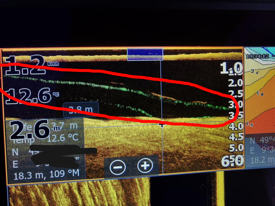 Der Hecht auf dem Sidescan ist schön zu erkennen und über die automatische Messfunktion theoretisch auch direkt anzufahren - hätte ich einen passenden Bugmotor könnte ich einen Punkt setzen und mich über das Echo via Autopilot direkt auf den Fisch stellen.