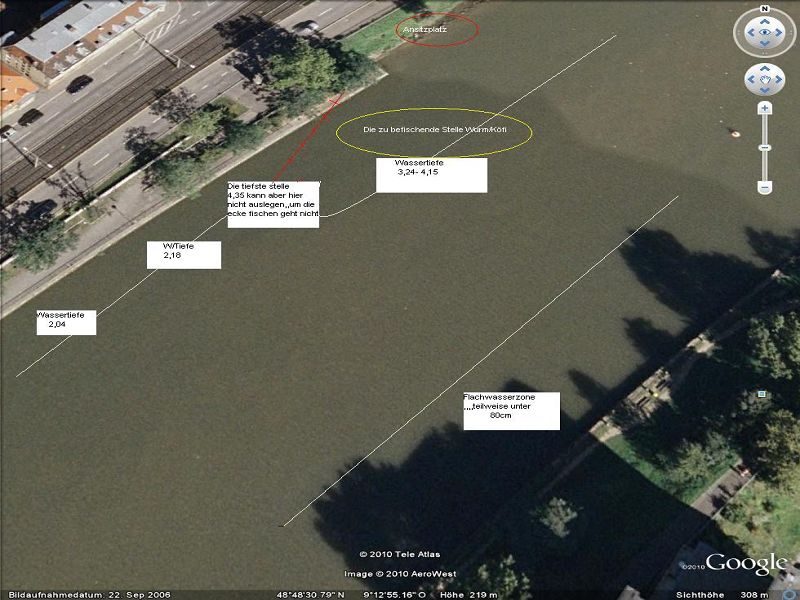 Auch hier wird es wieder ein Problem geben,,Baustelle ,,leider hat Google Earth brandaktuelle Fotos von 2006,,,,,,tja da wo jetzt noch Wiese auf dem Foto ist ist auf der Hälfte ne Baustelle ,,wird wohl n neuer Anlegeplatz oder so . Unter ,neben oder an der Brücke kann man auch nicht so einfach fischen weil sie dort die alte Brücke gesprengt haben und der ganze Scheiss jetzt immer noch drinn liegt ,,,Hänger bis zum abwinken,,,,und die Strömung ist dermassen wechselhaft das ist ein Grauen,,,also geht das mit dem Planer nicht mit wenig Srömung =?