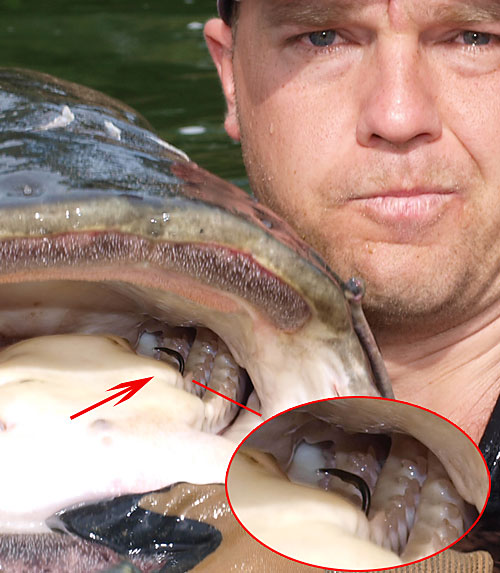 Ich bin fest davon überzeugt, dass der Waller einen "Qualitätshaken" ähnlich wie auf dem Foto sitzend, im besten Fall über Jahre hinweg nicht los wird.