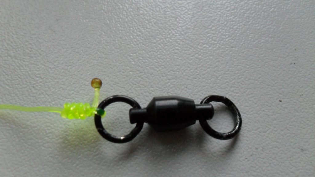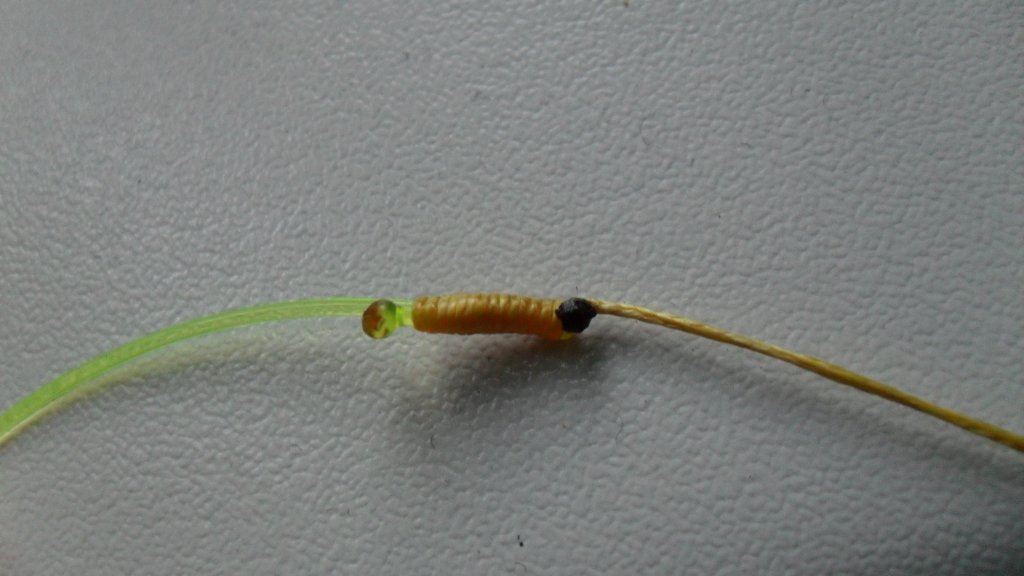 Das hab ich jetzt in meinen ersten Versuchen auch noch so gemacht, aber statt hinter dem "Auge" einen 8er Knoten zu machen kommt da jetzt halt eine oder zwei Klemmhülsen dran. Das macht das ganze viel kleiner, das Vorfach bleibt "gerader" und halten tuts auch gut. Da ich den Hülsen nicht traute, bzw. der Kraft, die ich zum Klemmen aufgewendet hab, hab ich alle Vorfächer einen Zugtest unterzogen...und sie halten...