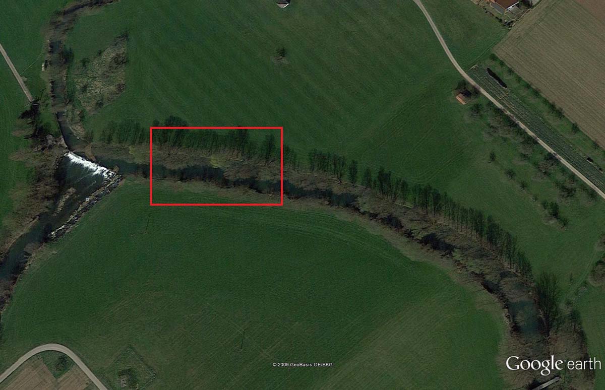 hab mal ein Bild dran gehängt wo ich fischen möchte! Viel Bäume, 3-4 Meter tief an dieser Stelle! und viel Wurzeln unter Wasser! der Waller sitzt oder Sass im Sommer in seiner Höhle!