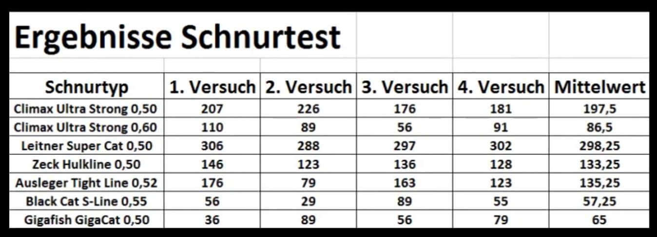 Daß die Abriebfestigkeit nicht allein mit der Schnurstärke im Zusammenhang steht, läßt sich ganz einfach an den ersten beiden Positionen in der Testtabelle ableiten. Die 0,60 er Leine bringt in allen Versuchsreihen schlechtere Werte