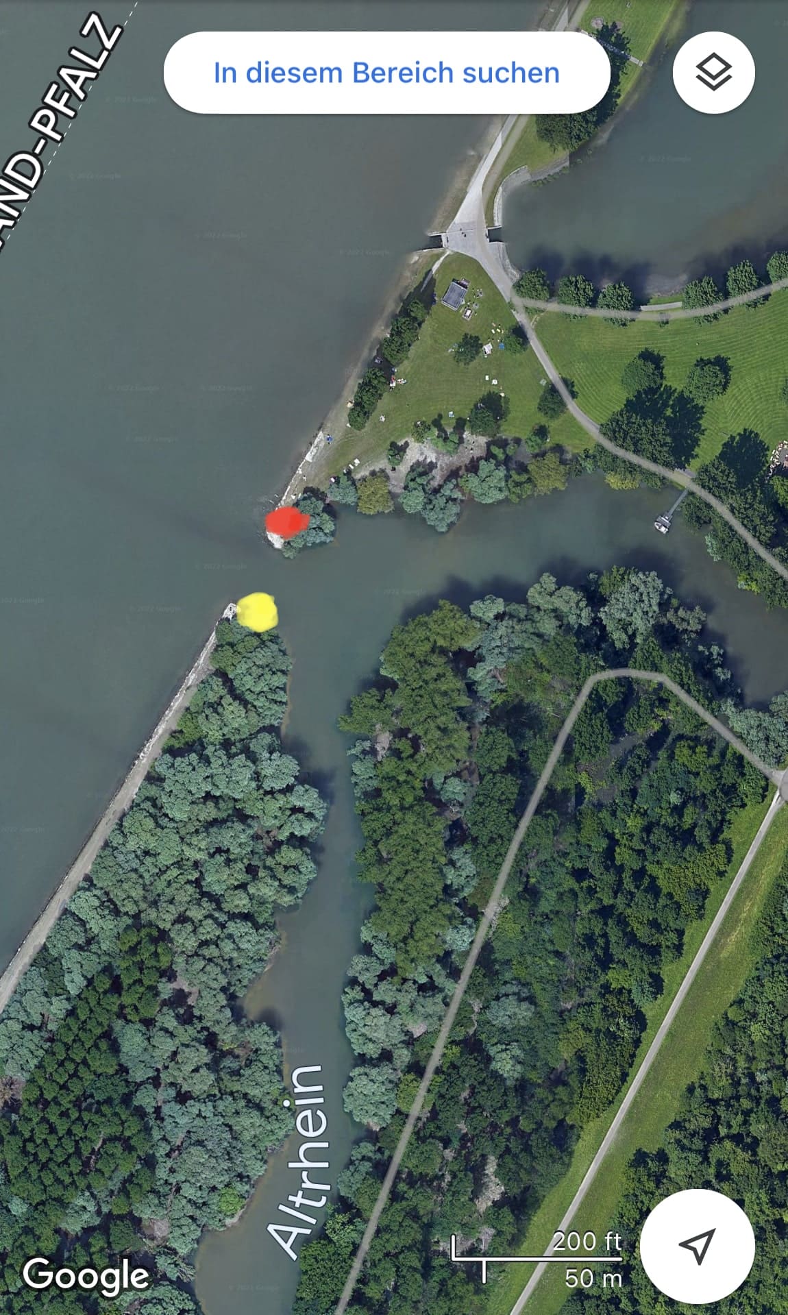 Also ich würde dann etwa dort hinlegen wo der gelbe Punkt ist, aber halt weiter draußen wo die Steinschüttung in die Flußsohle übergeht. Ob das allerdings nur mit Werfen noch möglich ist kann ich hier schlecht abschätzen.