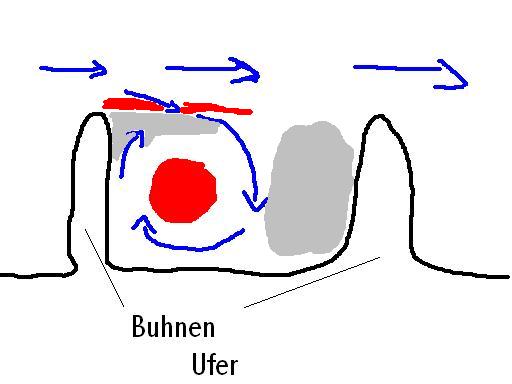 In der Stömung ist es meistens tief und dann am buhnenkopf ist parallel zur stömung meist eine Kiesanhäufung.