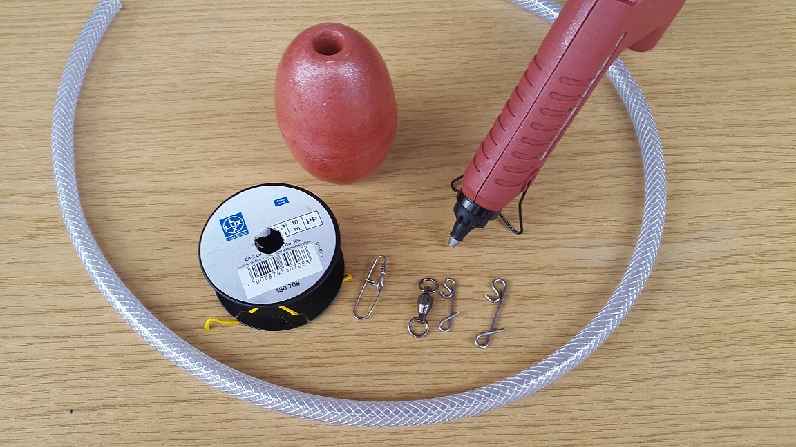 5. Die Schnur durch den Schlauch führen 20-30 cm vom Ende der Schnur entweder einen Knotenlosverbinder, einen zurecht gebogenen VA-Draht oder einen aufgebogenen Einhänger befestigen.