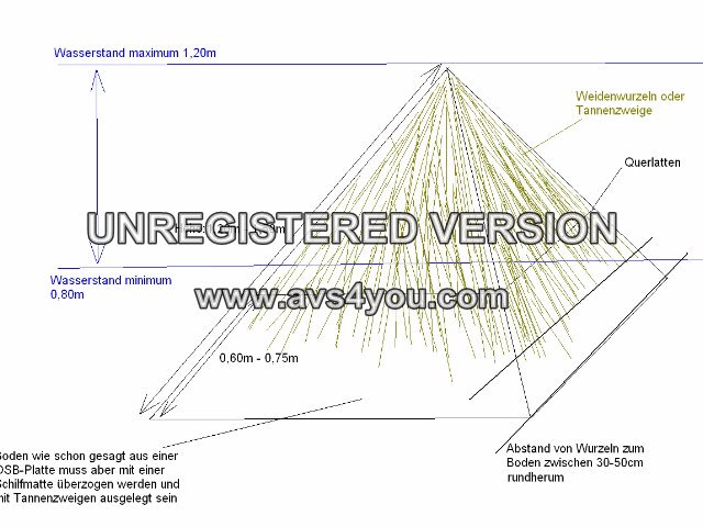 Es ist eine Art Pyramide mit einer Seitenlänge von etwa 1,2m-1,5m. Mit Querlatten in halber Höhe verstärkt. Die Querlatten sind auch zum behängen von Weidenwuirzel gedacht um das ganze noch schattig/dunkel zu machen. Die Bodenplatte am besten aus einer OSB Platte bespannt mit einer Schilfmatte. Darauf ein paar Laichschnüre oder wer es natürlich mag Augenzwinkern auch frische Tannenzweige.