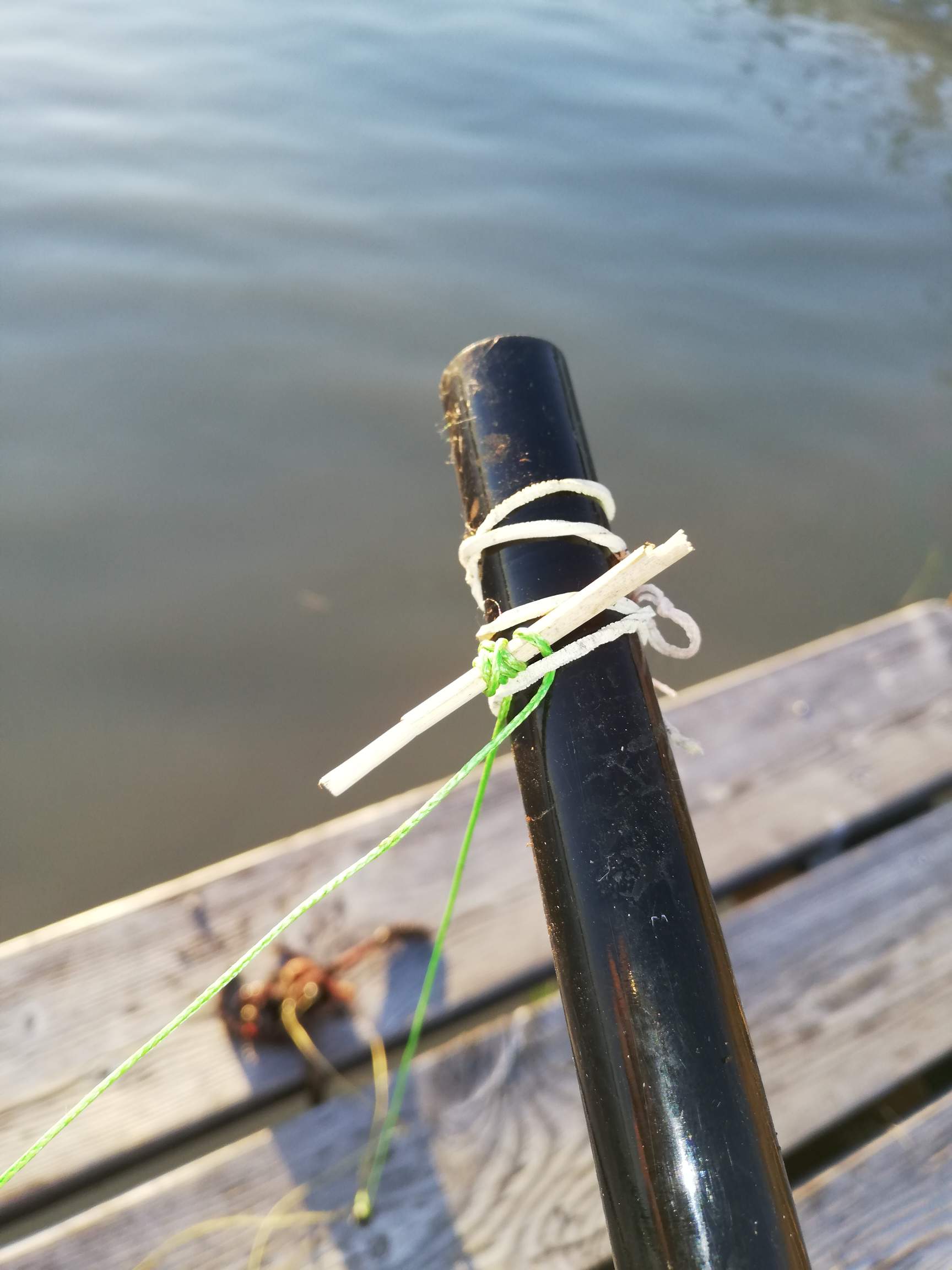 Genauso fische ich zur Zeit am See. Ich wickle die Schnur einfach um ein Stück Schilf und fixiere das dann mit einem Gummiband. Etwas Schilf haben wir ja am See rofl