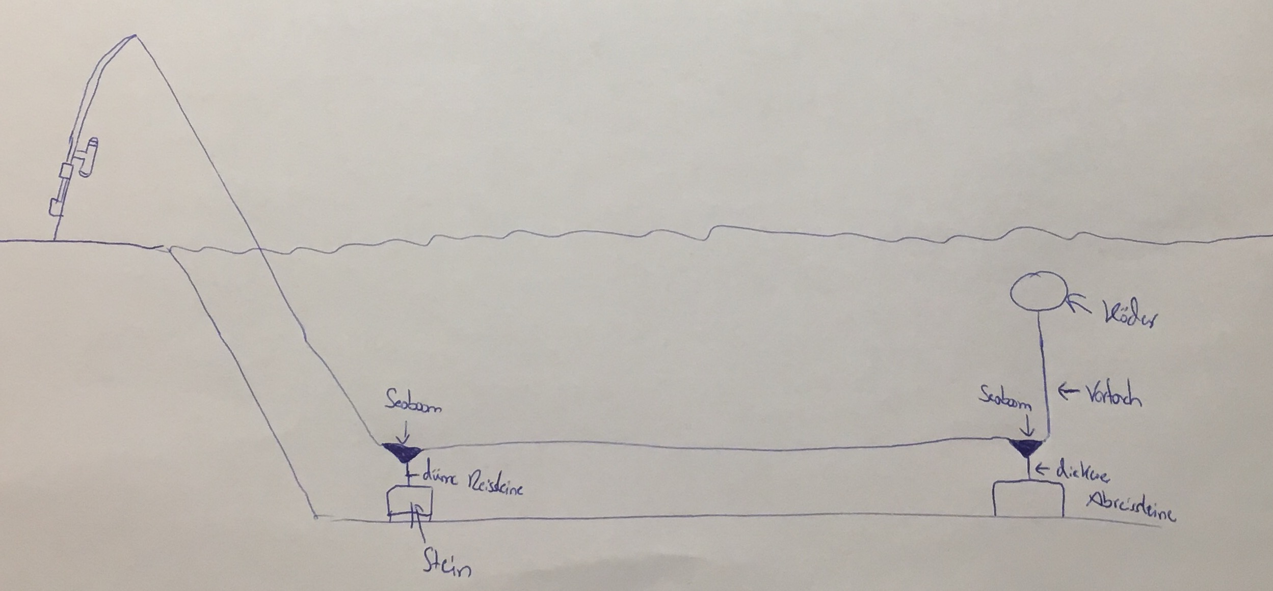 Gefischt wird eine Steinmontage mit Abreißleine, das Vorfach soll etwa einen Meter lang sein und der Köder (Fisch tot, Tintenfisch oder Würmer) wird durch Schaumstoff aufgepoppt. Nun habe ich vor, direkt nach der Uferkante einen weiteren Stein an einer dünneren Reißleine einzuhängen. Dadurch verläuft die Schnur direkt relativ tief bzw. dicht am Grund.