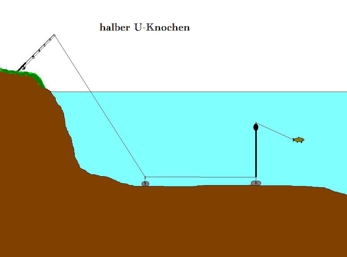 wir senken die steine mit 2 seabooms (+ reißleine) auf der hauptschnur ab. wenn die steine sammt u-knochen in stellung gebracht wurden, lässt man die spannung der montage nach und der knochen kommt senkrecht mit dem netzschwimmer nach oben.