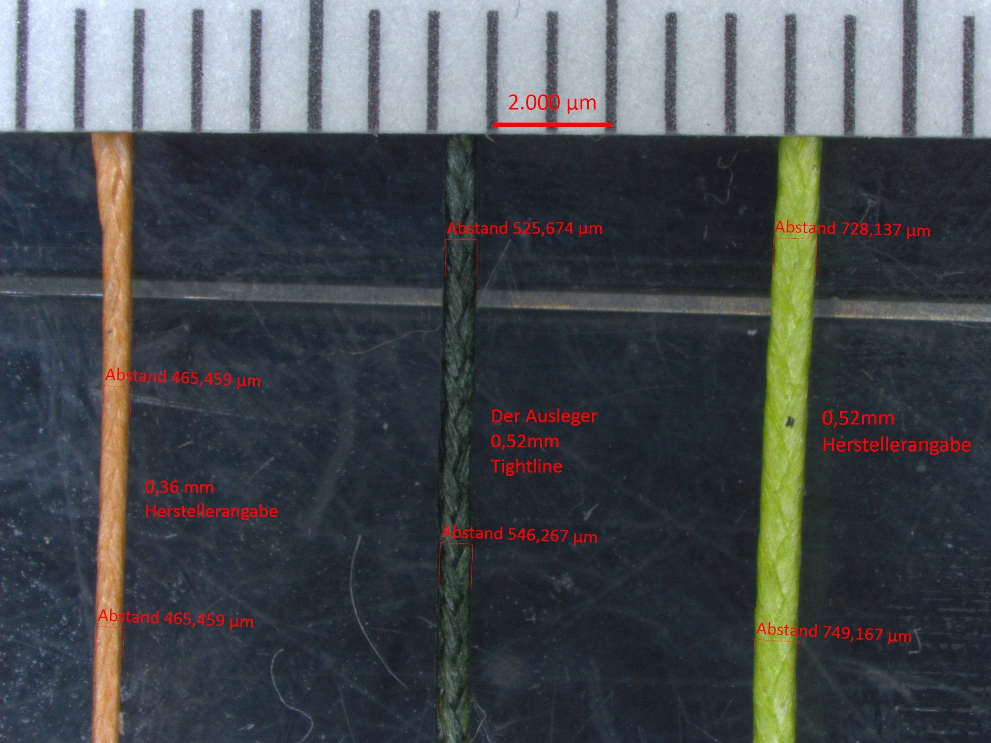 Meine Tightline Schnüre sind tätsächlich im Labor unter dem Lichtspaltmikroskop vermessen. Die Referenz 0,52mm eignet sich also gut für einen Vergleichstest.