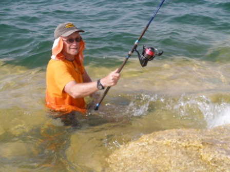 auf den rat von ramadan, der es sich auf den felsen hinter mir gemütlich gemacht hatte, schmiss ich schnell den kleinen mitsamt wobbler wieder rein, in dr hoffnung er würde von dem großen geschnappt.