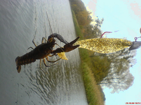 Leider habe ich kein bild dazu,aber bei mir wars mal ein kuhschädel,weil bei uns irgendwelche leute vom schlachter oder privat kuhköpfe ins wasser schmeißen mit na wäscheleine,habe letztes jahr zwei stück aus den wasser gezogen,wa sehr sehr köstlich gewesen kotz !