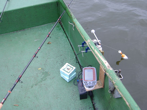 Entweder Schnur in der Hand, oder mittels Scotty Clip der an der Bordwand hängt neben dem Boot verankert...